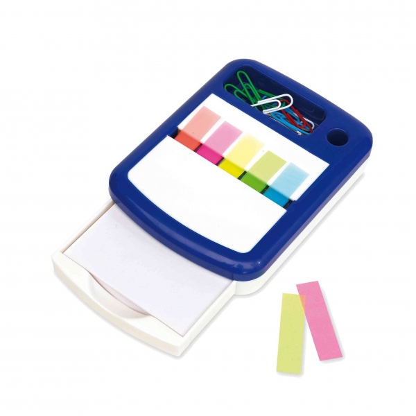 Descripción: Plástico. Incluye block de hojas blancas. Dispensador de banderitas de 5 colores diferentes. Compartimento para clips (incluidos). Porta lápiz.