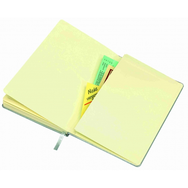 Descripción: Pastas de cartón. 80 páginas rayadas. Separador de hojas en tela. Cierre con banda elástica.