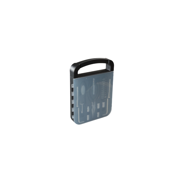 Descripción: Juego o set de herramienta con caja plástica de tapa transparente.