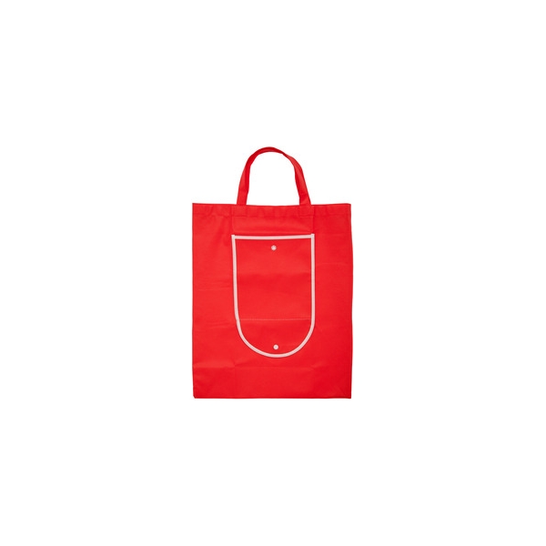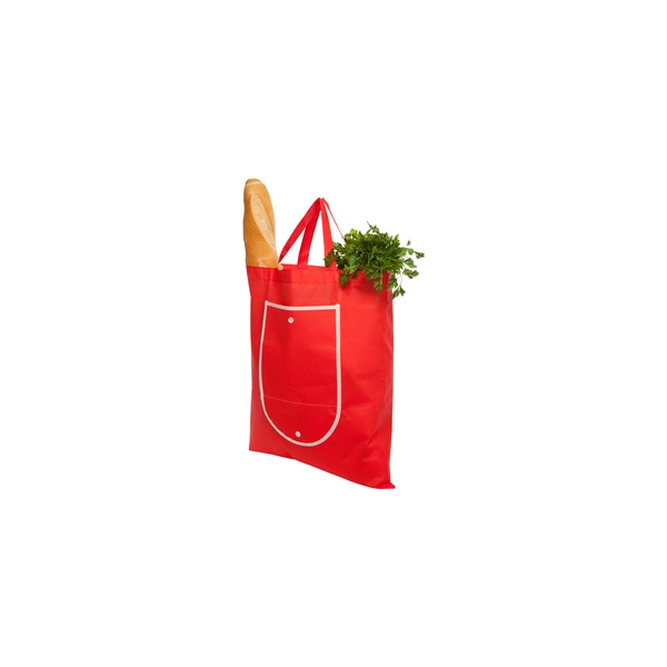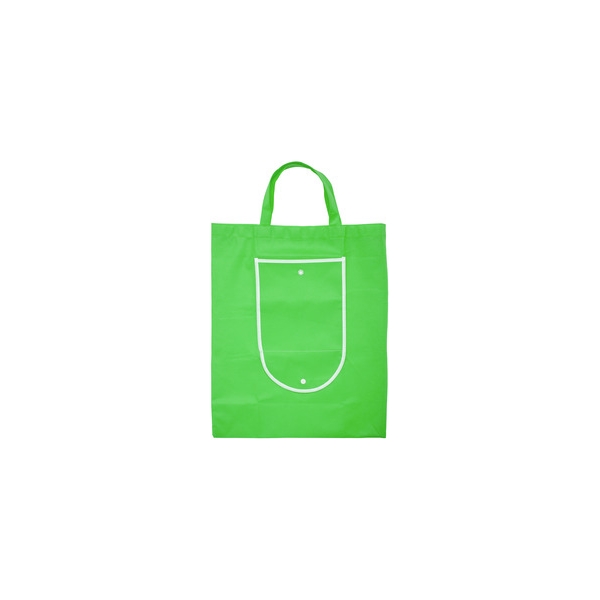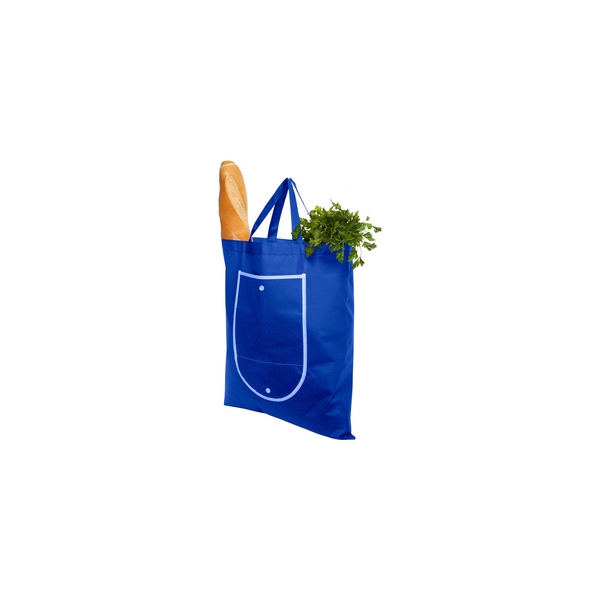Descripción: Non-woven. Bolsa que posee un bolsillo frontal con vivos blancos alrededor y un broche de botón.