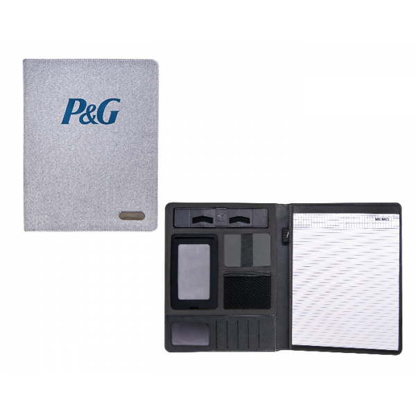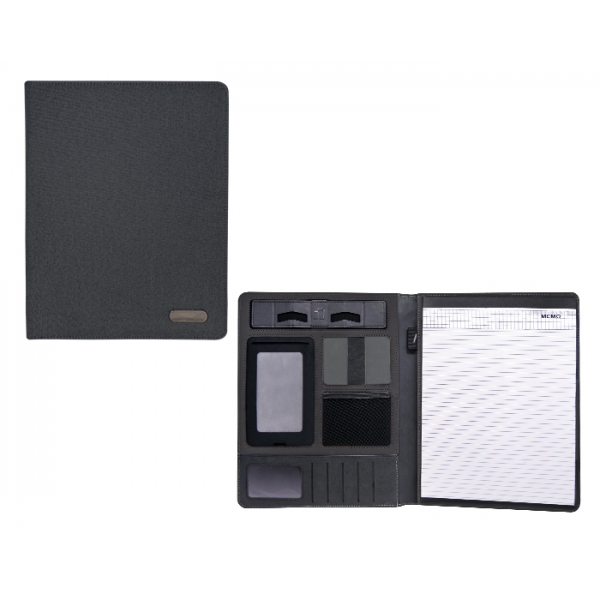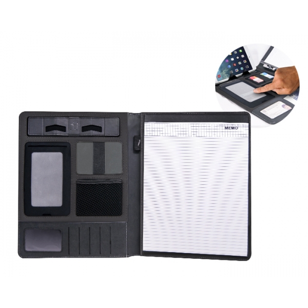 Descripción: Carpeta multiusos con block de notas tamaño carta de 20 hojas rayadas. Cuenta con cinta elástica para ?jar bolígrafo (no incluye), y 2 soportes ajustables con velcro para sujetar tabletas y celulares, lo que permite usar sus dispositivos móviles en cualquier lugar. Incluye funda especial para Smartphone con super?cie que permite utilizar el teléfono desde el exterior; compartimento con ventana plástica para credenciales y divisiones para tarjetas, así como bolsa de malla y banda elástica, idea