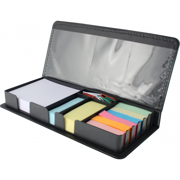 Descripción: 150 notas en cada bloque (varios tamaños) y clips colores varios, contenidos en estuche de plástico negro y cubierta tipo curpiel.