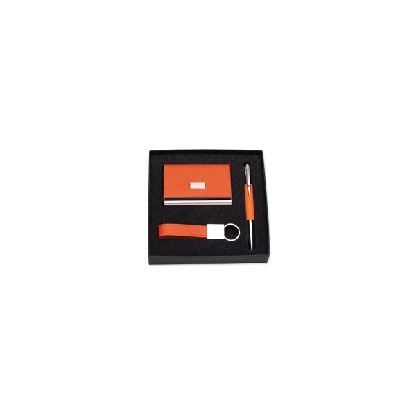 Descripción: Set de tarjetero, llavero y bolígrafo. Metal color plata con vinil naranja. Se entregan en caja.
