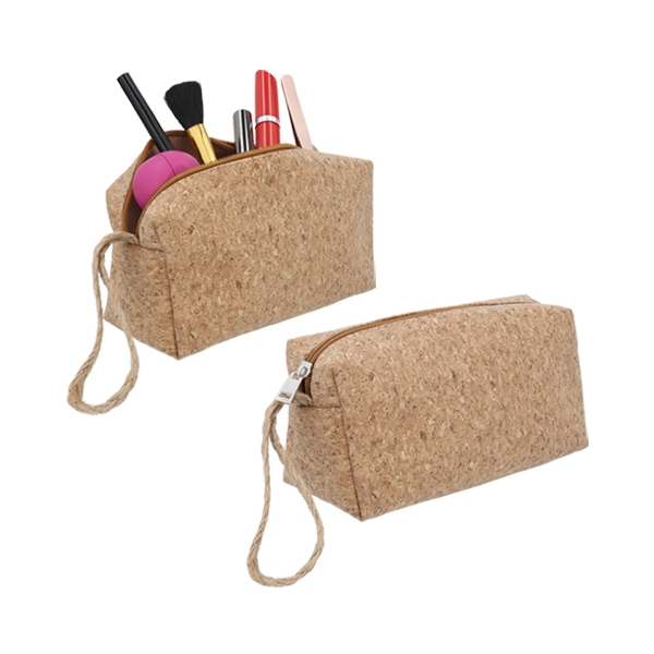Descripción: Cosmetiquera de corcho con cierre y asa de yute.