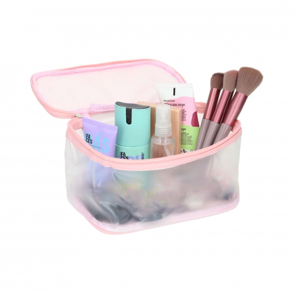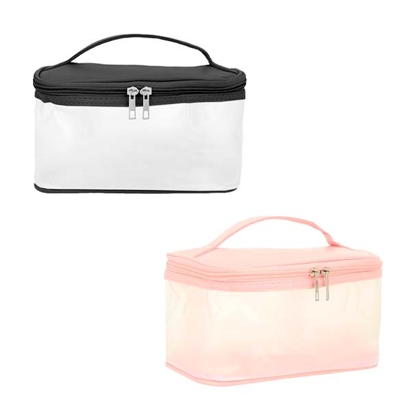 Descripción: Cosmetiquera rectangular con asa y doble cierre.